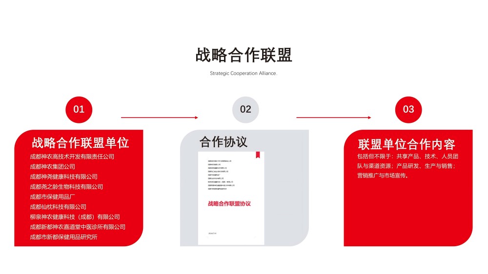 為了加強品牌合作、促進行業共同發展,本著優勢互補、平等互利的原則,成都神農高技術開發有限責任公司、成都神農集團公司、神農嘉道堂健康科技(成都)有限公司(原名:成都神堯健康科技有限公司)、成都神農嘉道堂藥業有限公司(原名:成都堯之齡生物科技有限公司)、成都市保健用品廠、成都仙枕科技有限公司、柳泉神農健康科技(成都)有限公司、成都新都神農嘉道堂中醫診所有限公司、成都市新都保健用品研究所九方就產品研發、生產與銷售、營銷推廣與市場宣傳等事項達成戰略合作。