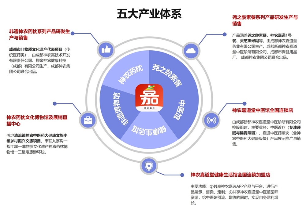 神農嘉道中醫藥大健康產業平臺依托自身基底與資源優勢,重點布局神農藥枕、堯之齡素餐、神農嘉道堂中醫館連鎖店、神農嘉道堂健康生活館連鎖店、神農藥枕非遺博物館等五大產業。