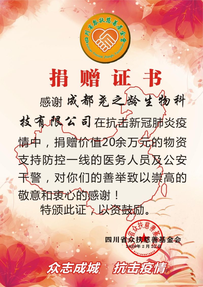 豈曰無衣,與子同袍。為協(xié)助對抗新冠肺炎疫情,成都堯之齡生物科技有限公司秉持“一方有難,八方馳援”、“多一家企業(yè)出一份力,社會上就能多一份力量”的理念投入到支援疫情洪流中,在力所能及的范圍內(nèi)盡企業(yè)的社會責(zé)任,捐贈價值20余萬元的物資支持防控一線的醫(yī)務(wù)人員與公安干警。