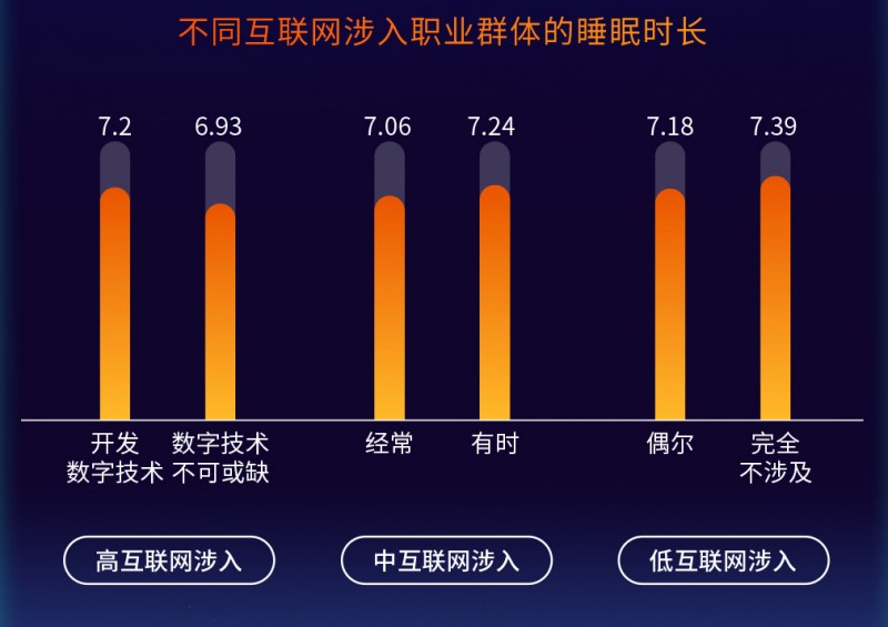 報告顯示,不同程度互聯網涉入職業群體每晚平均睡眠時長在8個小時及以上的比例均低于50%。涉入互聯網程度越深的職業,睡眠時長越短。低互聯網涉入職業群體的睡眠時長顯著長于其他組,高互聯網涉入職業群體的睡眠時長顯著短于其他組。