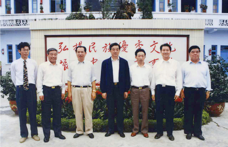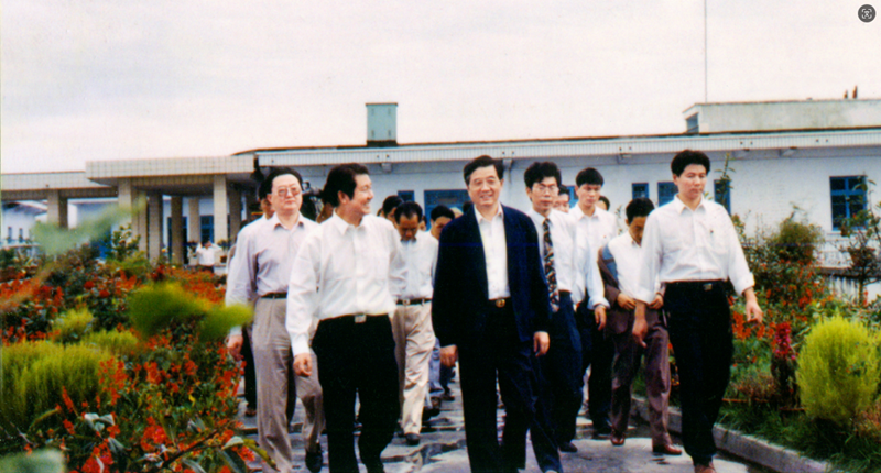 1996年9月17日,原中央委員會(huì)總書記、中華人民共和國(guó)主席,時(shí)任中央政治局常委、中央書記處書記、中央黨校校長(zhǎng)胡錦濤(左四)在中共四川省委書記謝世杰(左三)、省長(zhǎng)宋寶瑞(右一)、中共成都市委書記黃寅逵(左二)等領(lǐng)導(dǎo)同志陪同下視察成都神農(nóng)集團(tuán)公司,與原成都神農(nóng)集團(tuán)公司董事長(zhǎng)馬留文(右二)一起合影。