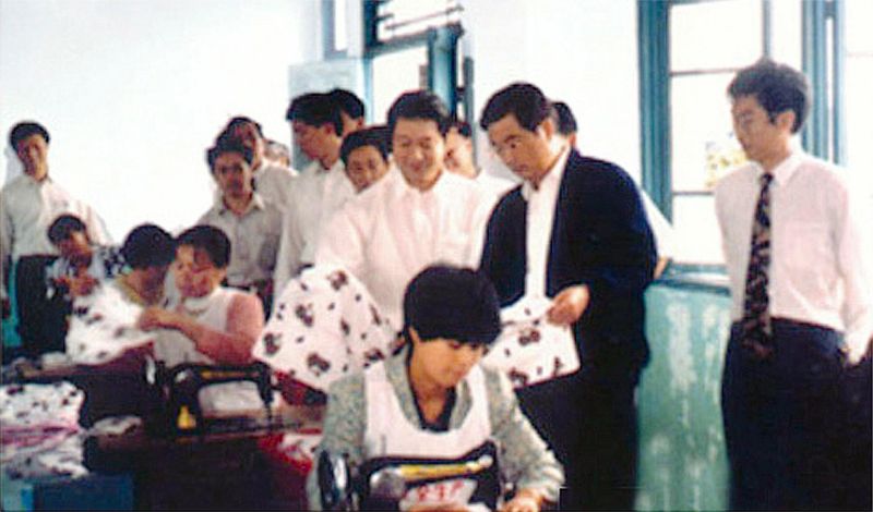 胡錦濤同志(右二)視察成都神農(nóng)集團(tuán)公司時,深入到車間了解情況;原集團(tuán)董事長馬留文(右三)向總書記匯報神農(nóng)藥枕的生產(chǎn)情況。