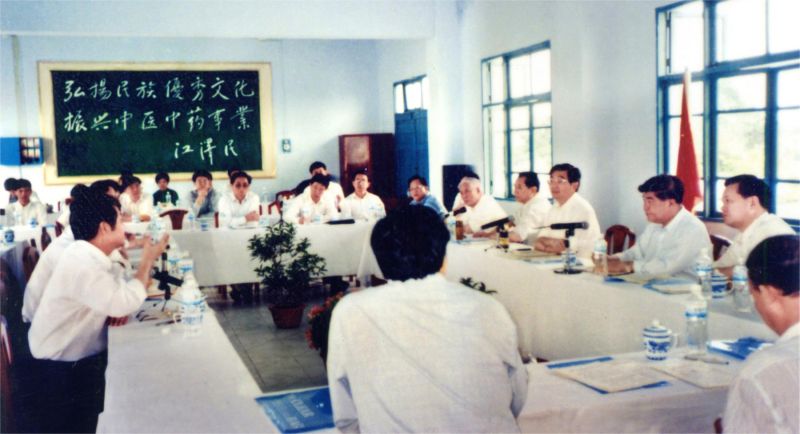 中共中央總書記胡錦濤(右四)在省、市領(lǐng)導(dǎo)同志陪同下視察成都神農(nóng)集團(tuán)公司,在聽取了原公司董事長馬留文(左前排左一)關(guān)于產(chǎn)品的開發(fā)情況匯報后,作了重要指示:“希望你們多開發(fā)一些安全有效的醫(yī)療保健產(chǎn)品,要為人民的健康事業(yè)作更大的貢獻(xiàn)。”
